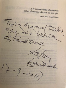 Leo a este poeta desde hace no sé cuántos años, he perdido la cuenta. Una vez que estuvo en Santiago de Compostela, le pedí que escribiera algo en uno de mis libros, El centeno nace bajo el invierno (2003), un título del que acabé conociendo formaba parte de sus versos, un feliz hallazgo que tuvo lugar antes de mandar la obra a la imprenta, por lo que me fue posible incluir en ella -ver la fotografía- la correspondiente cita del autor. En ese momento, septiembre del año 2010, con su letra inconfundible, Gamoneda escribió bajo su propia referencia lo siguiente: “Para Manuel Pombo, que me honra citándome”, con premura y a pesar de la oposición de quienes dirigían el evento, más preocupados de su protagonismo, eso pienso, que de su invitado. Quizás las tierras de León y de mi Sarria (Lugo) natal nos hayan marcado con ese conocimiento sobre el centeno, tan representativo de unas tierras, ya no digamos “por aquellos años”, tan necesitadas de sacrificio y de esfuerzo, tan complicadas para la poesía, y que nos llevaron e encontrarnos en las mismas palabras.